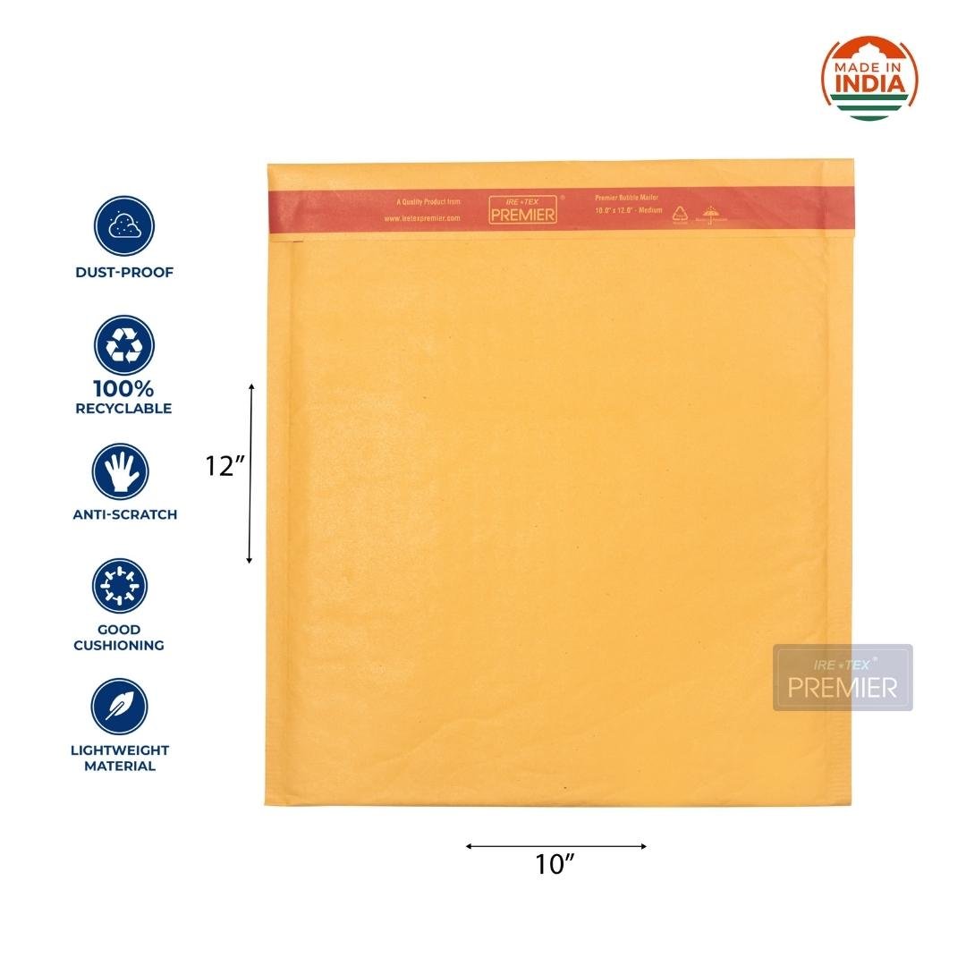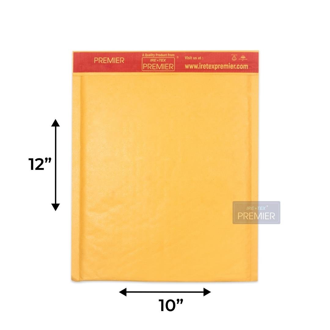Premier Paper Bubble Mailers & Padded Envelopes come in 10″ X 12″ Inch. These padded envelopes are packing envelopes made by laminating high-quality, 100% recyclable, air bubble sheets inside 90gsm Kraft paper.