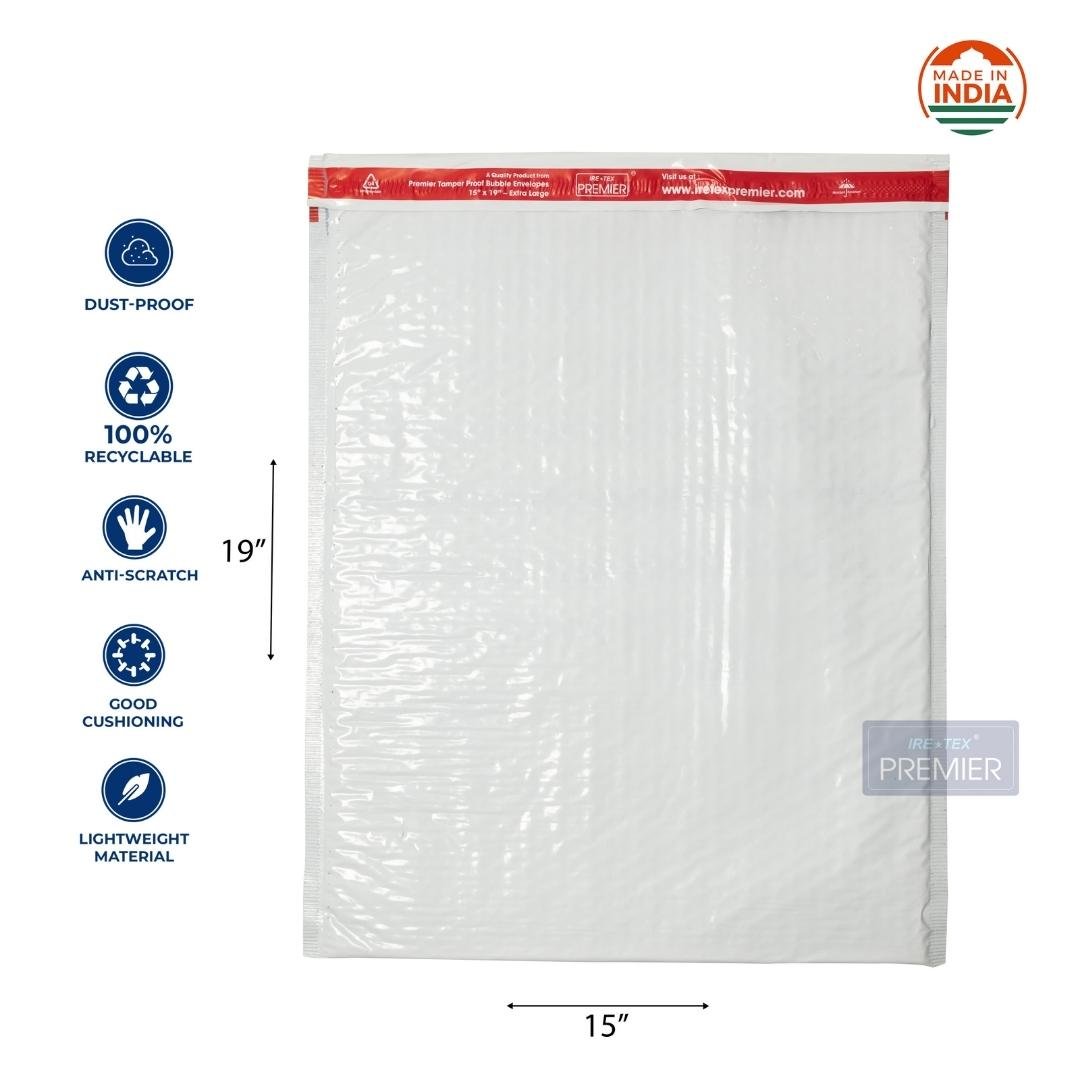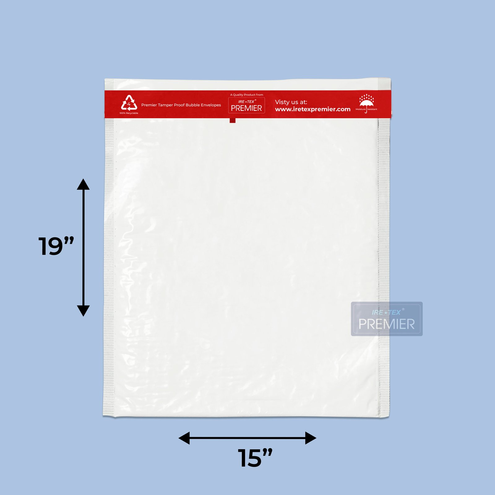 Premier Tamper-Proof Poly Bubble Mailers & Padded Envelopes come in 15″ X 19″ inches. These padded envelopes are packing envelopes made by laminating high-quality, 100% recyclable, air bubble wraps inside tamper-proof mailers.